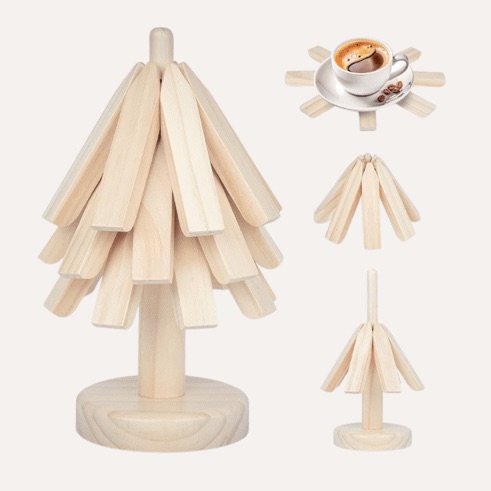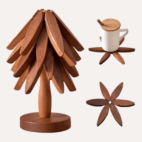 Available in two stunning finishes—black walnut and beech wood—these trivets complement both fall and winter decor themes, adding a natural, rustic elegance to your table settings. When not in use, they assemble into a decorative tree, making them as visually striking as they are functional.